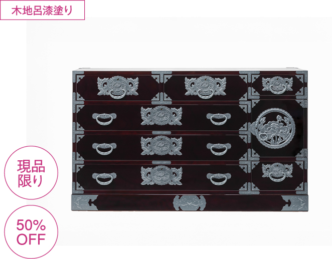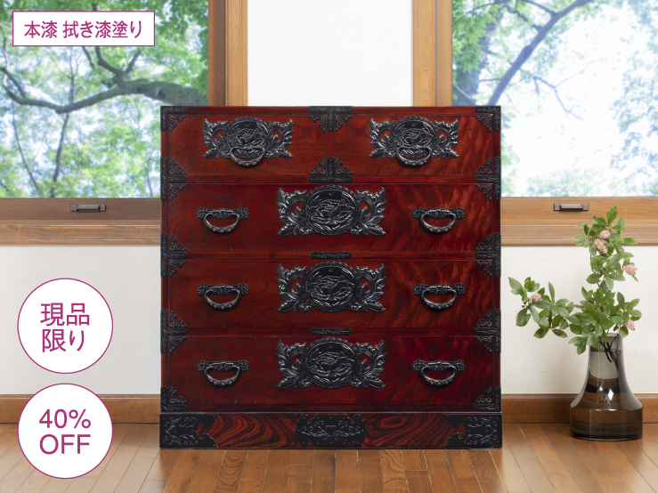 ※仙台箪笥の材質は右記の仕様になります。♢表面材/欅突板 ♢引出材/桐無垢材 ♢塗装/本漆 ♢金具/特製鍛造金具