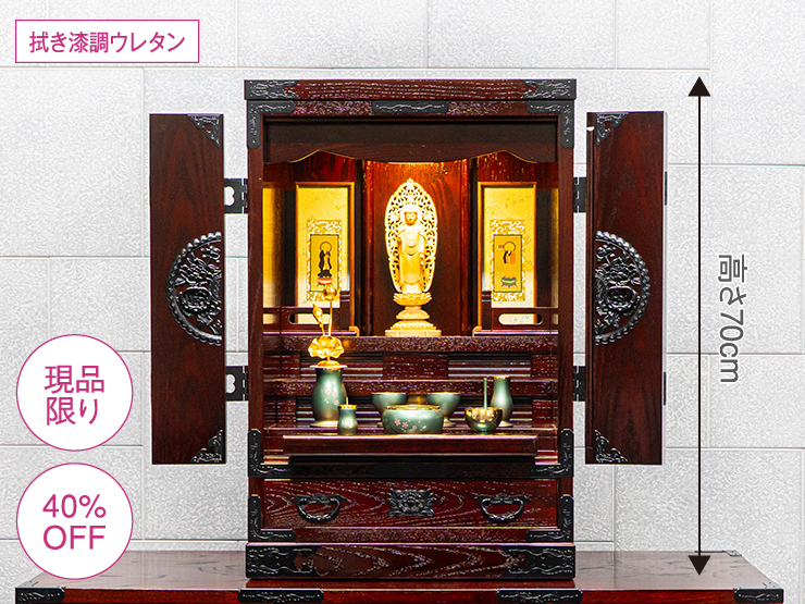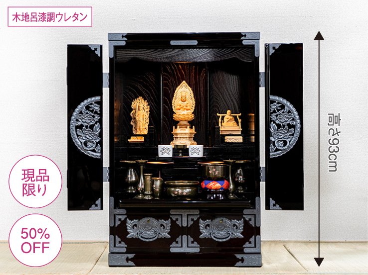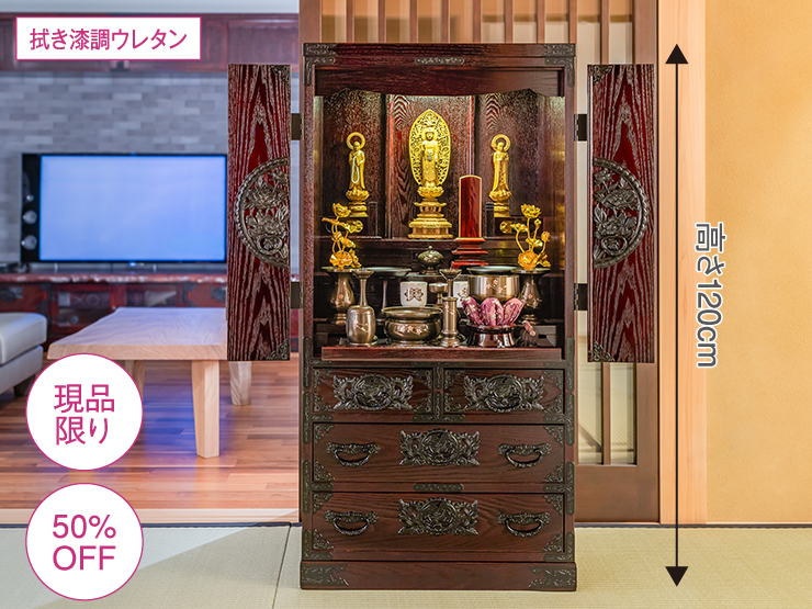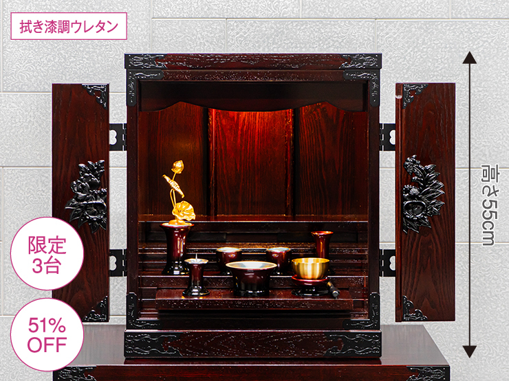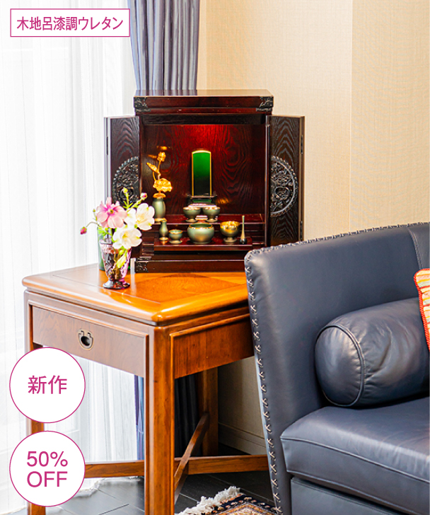 ご先祖様を祀るための祭壇として、伝統に基づき作られた上置きタイプの仏壇。床の間やコンソールの上など、置き方はさまざま。ご本尊や仏具をゆったりと納められる、ゆとりある設えが魅力。期間中、ご購入の方には仏具セットを進呈。
