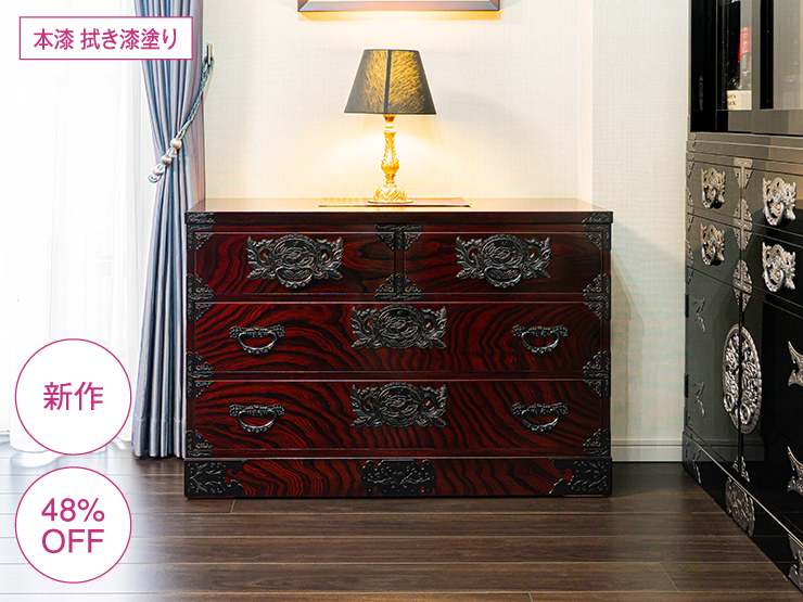 木目を引き立てる漆塗りにより、使うほどに色艶が深まる経年美が魅力の『欅産業』の仙台箪笥に新作登場。高いデザイン性と抜群の収納力を備え、幅広いシーンで活躍してくれそう。