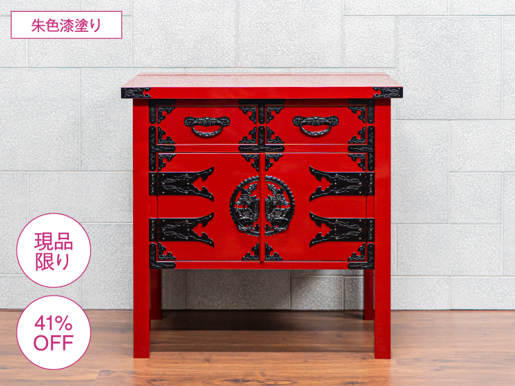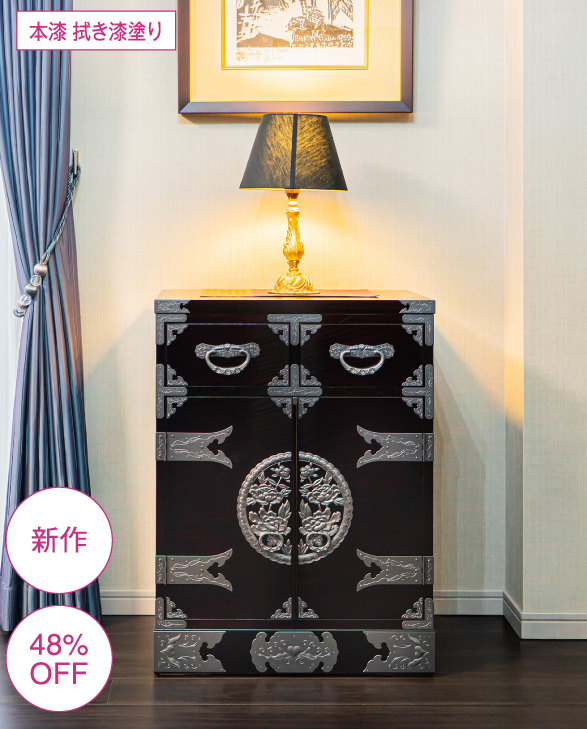 塗りや形によって、多彩な表情を見せる仙台箪笥の数々。使い込むほどに味わいが深まる“拭き漆塗り”や、古くから縁起の良い色とされる“朱色漆塗り”など種類はさまざま。暮らしやインテリアに合わせて選んでみて。