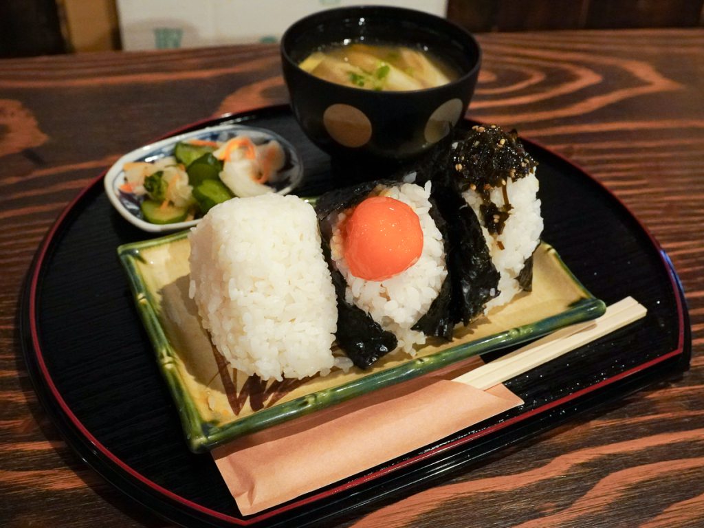 注文を受けてから握るおむすびのラインアップは、塩、おかか、梅、ねぎみそ、ツナマヨ、昆布のつくだ煮、サケ、めんたいこ、漬け卵黄の9種類で、1個120グラム。価格は、おむすび1個セット=660円、2個セット=880円、満腹セット(2個+塩むすび1個)=1,000円。単品でも、おむすび(250円~300円)、漬物(100円)、豚汁(300円)を提供する。テイクアウトにも対応する。