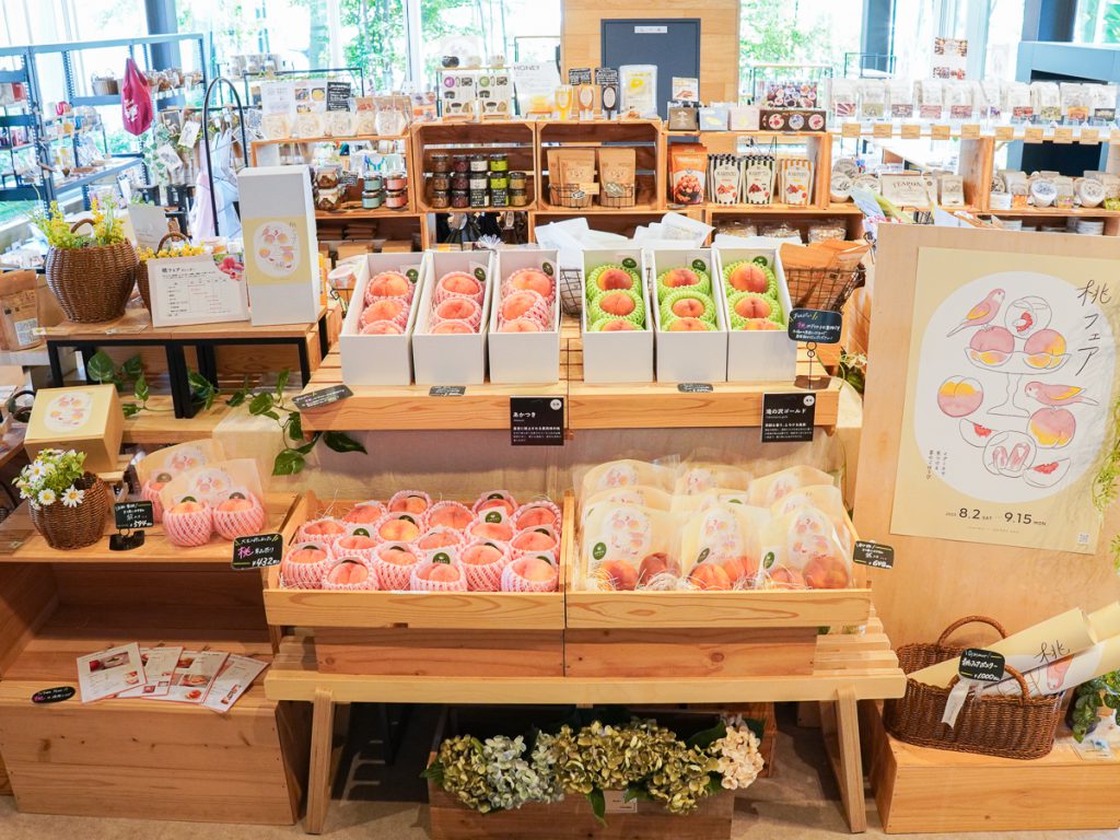 セレクトショップ「グッドスタッフ」では、山形県東根市の「ヤマガタ果園」から仕入れる桃を販売する。「あかつき」「滝の沢ゴールド」「陽夏妃」「ゆうぞら」「黄金桃」「川中島白桃」など、入荷に応じて2、3種類を用意。一般流通していない珍しい品種もある。価格は1個432円~。